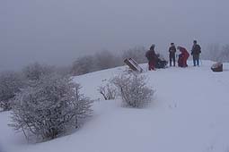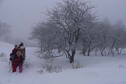 | ハンゼノ頭(標高1,681m)に到着。 ハンゼノ頭は三窪高原の中央部にあり、非常に展望の開けた場所だが、今回は霧で視界は全く得られなかった。 周辺にはツツジ類も多く、花期になると華やかだが、着雪したツツジも、また違った意味で華やかに見えた。 |