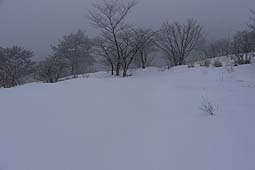 | 三窪高原の中心部・四阿のある付近に来ると広い草原状になる。 ルートを探しながら歩くが、雪質の柔らかい箇所もかなりあり、時折膝くらいのラッセルとなった。 |