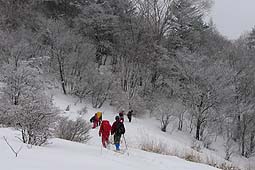 | ハンゼノ頭と柳沢ノ頭の中間鞍部まで戻り、そこから斉木林道に下るルートを採った。 ここも雪は深かったが、雪は以外と締まっており、大きなラッセルとはならなかった。 周囲は落葉広葉樹の樹林帯となっており、着雪した木々の中、快適なスノーハイクが楽しめた。 |