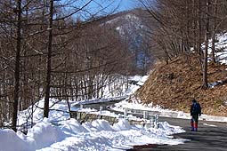 | 一ノ瀬林道を下山口の中島川口に車を止め、作場平の登山口まで林道歩きとなる。 林道は全線が舗装され、周辺には民家はないが、除雪されていた。。 林道の残雪は50cmくらいあるだろうか。 |