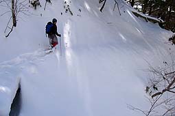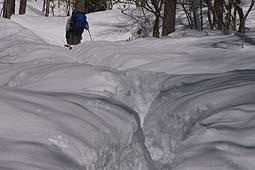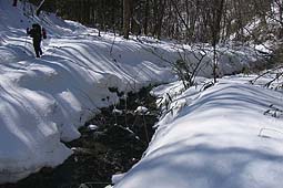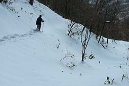 | 黒槐分岐から黒槐に入っても、上部の状況は縦走路と変わらず、雪深い。 沢に近い場所ではルートが非常に分かりにくく、確認しながら下る。 無雪期のルートが頭に入っていない限り、積雪期は使わない方が無難だろう。 |