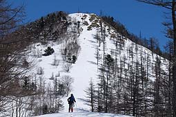 | 笠取山頂直下は急登に頂上に近いほどきつくなる。ここを一息であがるのはかなり大変だ。 また、上に行くに従って風を遮る樹木がなくなり、風が流れやすくなるためか、残雪は少なくなる。 頂に立てば、展望は広がる。 |