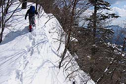 | 笠取山頂は細く長い峰となり、先に進むと吹き溜まりの深い場所では胸近くまで雪に埋もれたり、また場所によってはアイスバーンだったりと、通過には苦労する箇所もあった。 |