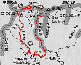 | (コース・タイム) 中島川口 9:00→ 9:20 作場平登山口→ 9:45 ヤブ沢・一休坂分岐→ [一休坂(尾根)]→ 10:40 笠取小屋 10:55→ 11:50 笠取山 12:20→ 13:15 奥秩父縦走路合流→ 13:35 黒槐分岐 13:45→ 14:50 中島川口(一ノ瀬林道) [天候 ;晴] [歩数 ;約20,100歩] |