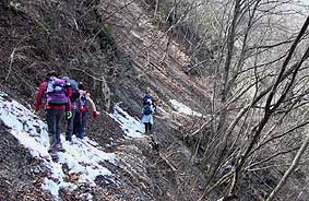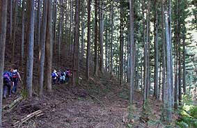 | 寸庭集落から登山道となるが、登山道入口はやや分かりにくい。 登山道はスギ等の植林帯の中を登っていく。 |
