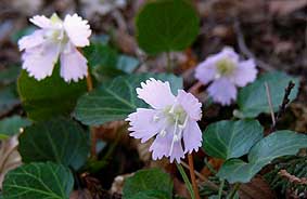 | 金比羅山は片側が越沢バットレスの最高点であり、岩場の山頂となる。 ここから広沢山への尾根が伸びている。 少し登った箇所にはにイワウチワの群落があり、いくつかの花が咲きはじめたばかりだった。 |