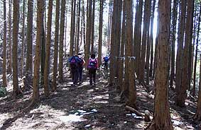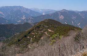 | 大楢峠を過ぎ、城山へは尾根通しに行く。しばらくは緩やかな下りが続き、最後城山へは植林帯の中を登り返す。 ここも植林帯が多く展望はほとんど得られないが、1箇所だけ、西側が開けた場所がある。途中には少し岩場があり、この周辺にはアセビが多い。 (樹間から見える山は城山) |