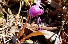 | 富士峰園地周辺の南斜面側の日溜まりではカタクリも幾輪か咲き始めていた。高木の芽吹きには尚早だが、低木は芽吹きが始まりかけていた。新緑となるのも近そうだ。 |