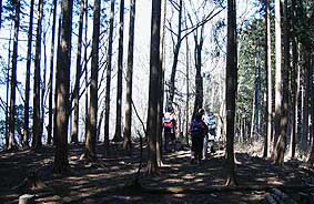| 城山山頂。ここも樹林帯の中で展望はないが、西側は落葉広葉樹林で、芽吹き前のこの時期は樹間から本仁田山、川苔山等が垣間見える。 城山からは、かなり急な下りが下降点・鳩ノ巣まで続く。 |