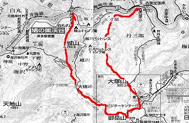 | (コース・タイム) JR古里駅 8:20→ 8:35 寸庭橋→ 9:10 金比羅山 9:25→ [鉄五郎新道]→ 10:35 広沢山 → 10:55 大塚山 11:55→ 12:10 御岳山 → 13:25 大楢峠 → 13:50 城山 14:00→ 15:00 JR鳩ノ巣駅 [天候 ;快晴] [歩数 ;約23,100歩] |