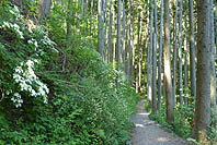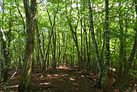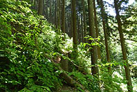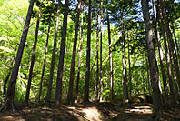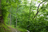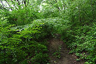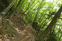 | 笠取林道:新緑の盛り | 石保戸山頂:幾分緑濃い | 指入峠へは防火帯に大木が点在 | 犬切峠への防火帯:刈払で草無し | |