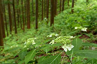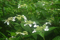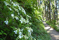 | ヤマアジサイ:下部で花の盛り | コアジアイ:上部尾根筋で咲き残り | ヤマボウシ:上部で花の盛り | ウリノキ:林道周辺花の盛り | |