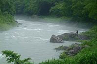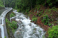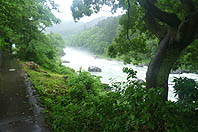 | 御岳渓谷周辺 :梅雨入り(6/5)後連日の強雨で多摩川はかなり増水している。今日も雨で人の姿は少ない。 | ||||