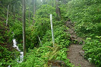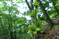 | ニガナ:尾根筋で花の盛り | アカショウマ:下部で咲き始め | バイケイソウ:下部沢筋で咲き始め | コジャノメ:林下で散見 | |