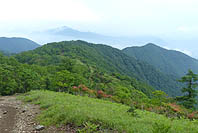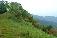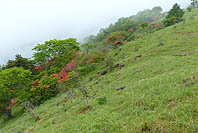 | 浅間尾根中腹:緑と霧に蒸せる | 鷹ノ巣山南面巻道:スズタケは消失 | 鷹ノ巣草原帯:ヤマツツジが点々と咲く | 鷹ノ巣山頂:ここも緑濃い | |