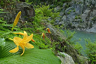 | 鳩ノ巣渓谷周辺 :梅雨入り後雨の日が多く、渓谷は増水している。歩道沿いのニッコウキスゲの花はやや遅め。 | ||||