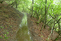 | 平溝川:連日の雨で増水 | 下部沢筋の道:下草が濡れ嫌らしい | 高水山頂:深い緑に包まれる | 尾根通しの道:アチコチで水溜まり | |