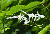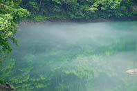 | 白丸湖周辺 : 雨のあがった湖面にはこの時期にたびたび出る靄が出ている。マタタビは花の盛りとなっている。 | ||||