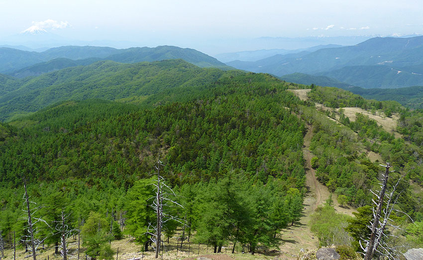 笠取山頂から草原を見る:霞んではいるが富士山と南アルプスが見える