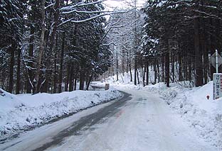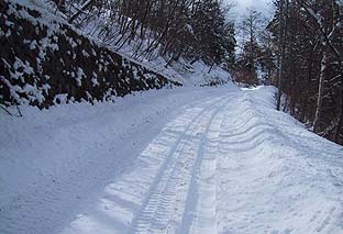 一ノ瀬林道 ※積雪30cm程度・日陰はもっと深い (ワダチがなければ普通の車は通れない) |