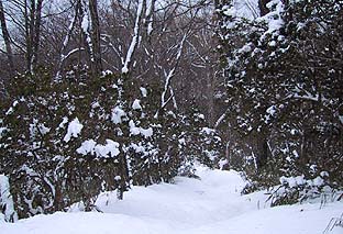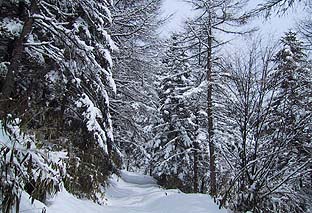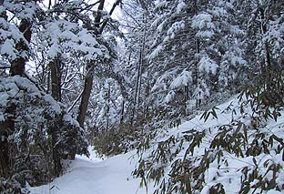 笠取小屋先の道 ※雪が深く枝に手が届く (吹き溜まりで積雪は楽に1mを越えている) |