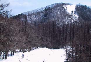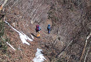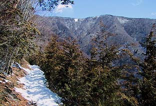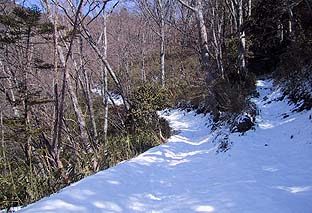 小袖登山口先(登りは緩やか) ※日向面の残雪はまばら (しばらくは植林帯と落葉樹が交互する) |