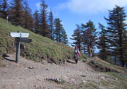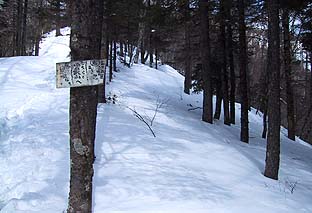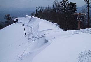 ← | 小雲取山(吹き溜まりで残雪は多い) ※↓無積雪期 (←指導標は完全に埋没) |