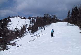 ← | 雲取山頂直下を行く ※正面には山頂の避難小屋が見える |