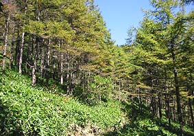 ← | 唐松尾根下部は名のとおりカラマツ林 |