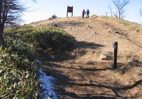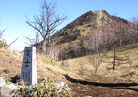 草原の小高い丘から見る笠取山 ※三角柱は多摩川、富士川、荒川と記されている |