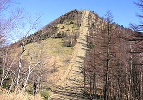 尾根コースから笠取山を見る ※直下は急な一気の登り |