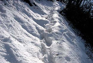 ← | 登山道に入るとすぐに崩壊箇所があり、沢に沿い迂回路が作られている ※一旦沢の対岸を歩く (この付近で30cm程度の積雪) |