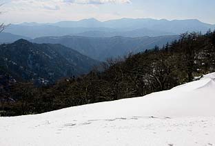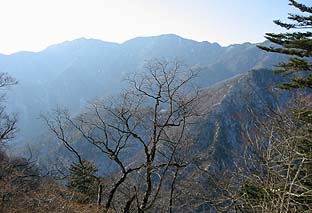 ← | ヨモギの頭から石尾根縦走路と七ツ石を見る ※右奥は御前山、左最奥は大岳山 |