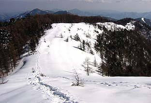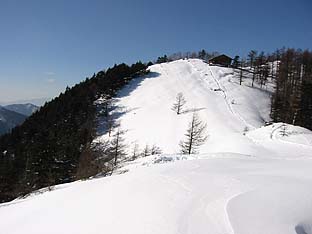 尾根中央部付近には伐採地がある ※正面は三ッ山、左手の窪みは北天のタル |