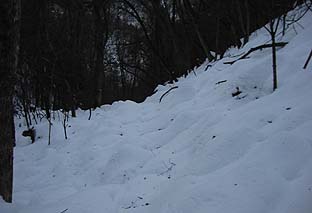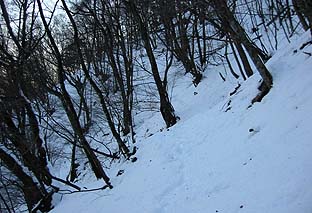 塩沢谷出会い ※少し沢筋を降り、再び斜面に取り付く ※雪が深くルートファインディングに苦労した (この時点で薄暗い) |