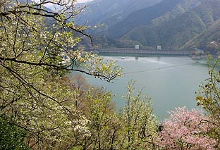 遊歩道上部から見る奧多摩湖 ※オオシマ、ヤマザクラはまだ咲いている |