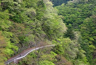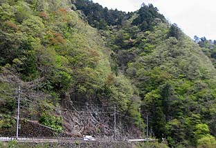 ダム下の国道・滝乗沢バス停(中央下部)周辺 ※周辺は新緑の盛り (バス停からむかし道への連絡路を登る) ※左上に向かう道 |