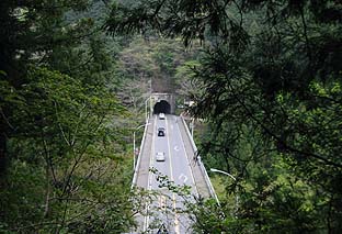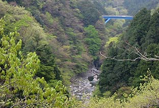 ← | 境・白髭神社先のむかし道から国道を見おろす ※中央の橋は御前山登山口のある境橋 |
