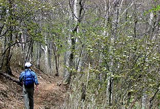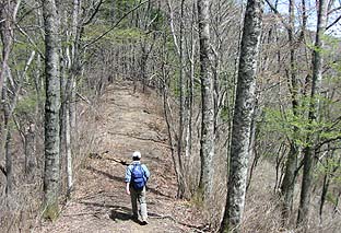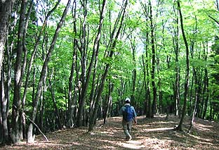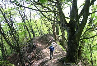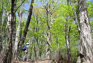 縦走路上には見事なブナ林もある ※灌木は芽吹き、周囲は柔らかい緑に包まれていた |