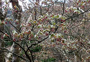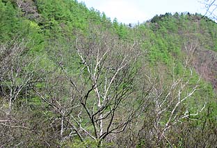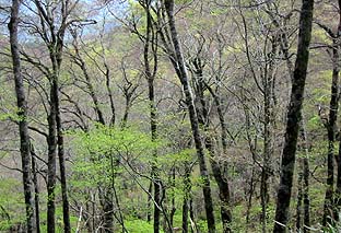 尾根の中腹まで登ると芽吹きは浅くなる ※標高1,300m位 |