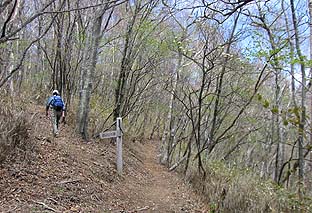長沢背稜合流 ※雲取山方面と酉谷山方面への道を分ける (カラマツ林は淡い芽吹き) |
