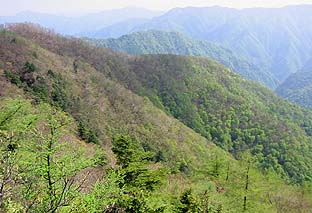 ← | ハナド岩から見る新緑の日原の谷とヨコスズ尾根 ※長沢背稜で最も展望の効く岩場の露頭 (奥に大岳山(左)と御前山もうっすら見えている) (※下から芽吹いていく様子が見てとれる) |