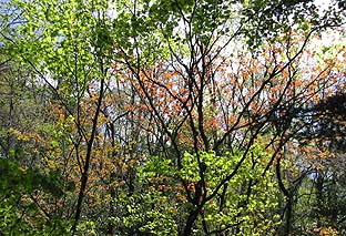 ← | カエデ(イタヤカエデ)の芽吹き(ヤブ沢中央部付近) ※芽吹きの頃の林は色彩も豊富だ |