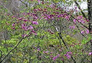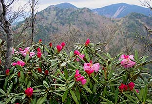 ← | 山頂周辺のアズマシャクナゲは一部で咲き始めた ※後方は奥秩父の山々 |