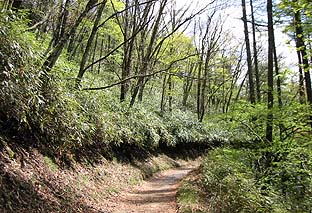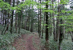尾根中央部付近はブナ・ミズナラ林に変わる ※淡い新緑となっていた |