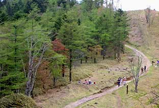 笠取小屋先はカラマツが淡い芽吹き ※右側は草原になっている |