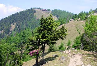 ← | ヘリポート付近を行く(この付近は平らな尾根) ※トウゴクミツバツツジがまだ咲き残っている |