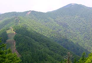 雲取山頂下の縦走路から飛龍山を見る (正面中央の高い山) |