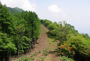 ← | 石尾根縦走路の都県境 ※縦に切れた防火帯を僅かに登ると尾根に出る (ここは南面の展望が効く) |