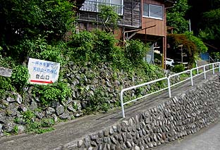 日原小学校跡入り口手前に登山道入り口がある ※車道の下には東日原のバス停が見える ※林に入るといきなり杉林の中の急登となる |